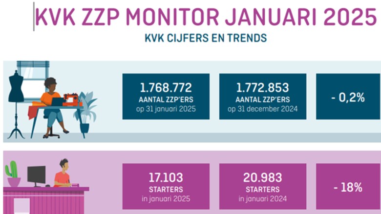 Het aantal zzp’ers is in januari verder afgenomen, na een eerste daling in december 2024. Op 31 januari staan nog 1.768.772 zzp’ers ingeschreven in het Handelsregister, ruim 4.000 minder dan een maand eerder. Dit blijkt uit de KVK ZZP-monitor over januari 2025.